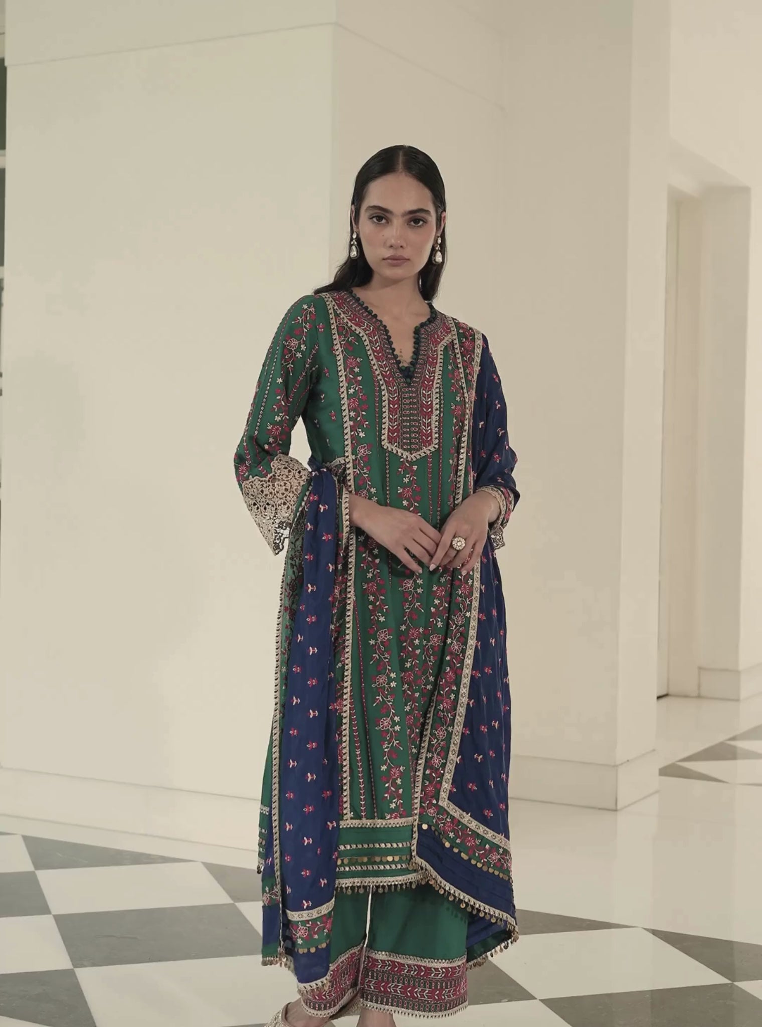 Khayal Pima Satin Bottle Green Kurta Set