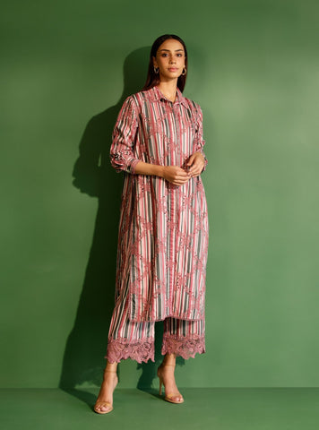 This Co-Ord Set Is A Seamless Blend Of Structure And Softness, Designed For Effortless Elegance. The Kurta Showcases A Striking Interplay Of Vertical Stripes And Intricate Floral Embroidery, Creating A Unique Texture And Depth. The Shirt-Style Silhouette Features A Structured Collar And Three-Quarter Sleeves, Balancing Sophistication With Ease. The Deep Navy Embroidery Against A Neutral Base Enhances Its Contemporary Charm, Making It Perfect For Both Casual Brunches And Evening Soirées.