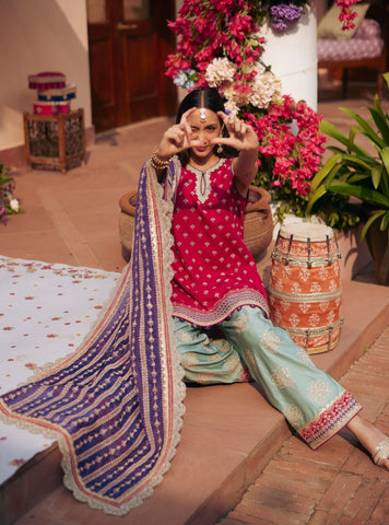 A refined festive set crafted in smooth, breathable Pima Satin with a soft sheen. The sleeveless kurta features delicate motifs and a clean neckline, designed to feel light yet elevated. Paired with relaxed Pima Satin pants for ease through long celebrations. Finished with a coordinating dupatta that adds colour and contrast without weighing the look down.