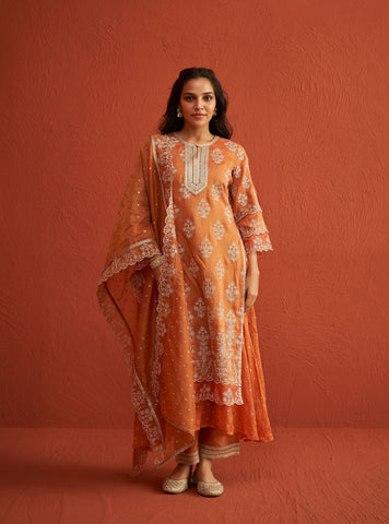 Paired With A Matching Dupatta, The Set Brings A Regal Feel To Any Occasion. The Dupatta Features An Embroidered Scalloped Border, And Scattered Booti Embroidery, Giving It A Festive Touch While Maintaining A Balanced And Elegant Appearance. The Pants Are Designed With Lace Accents At The Hem, Providing A Cohesive Finish To The Look.