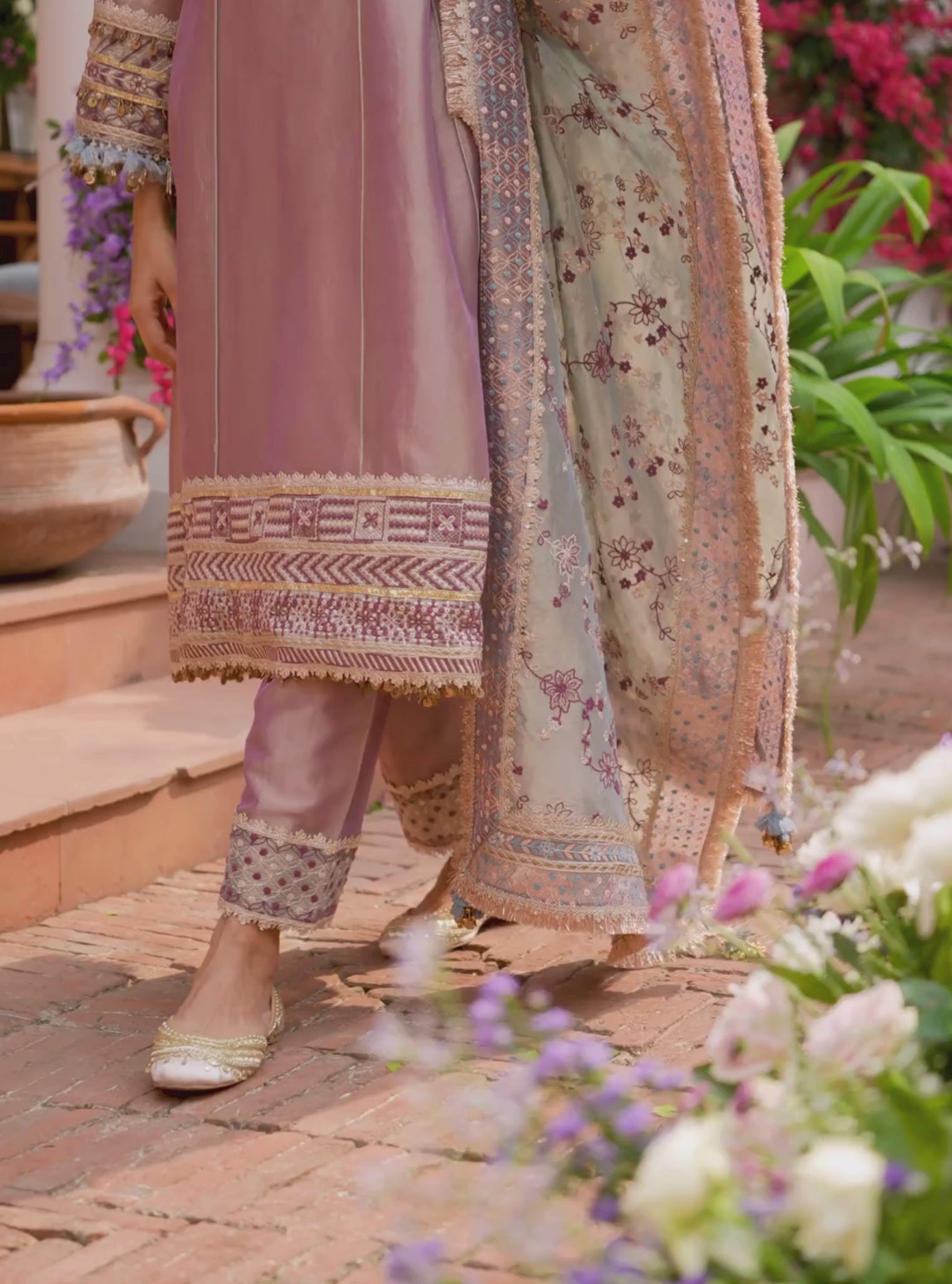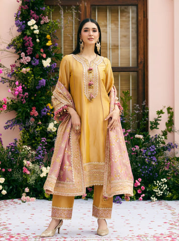 An elevated festive ensemble crafted in lightweight Tissue fabric with a gentle sheen. The kurta is detailed with delicate embroidery that adds texture while keeping the silhouette clean and graceful. Paired with matching Tissue pants for a soft, structured fall. Completed with a coordinating dupatta that brings balance and movement to the set.