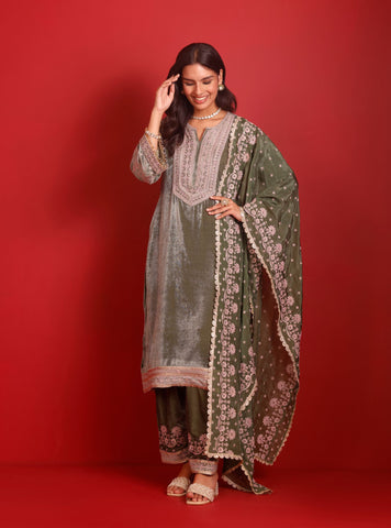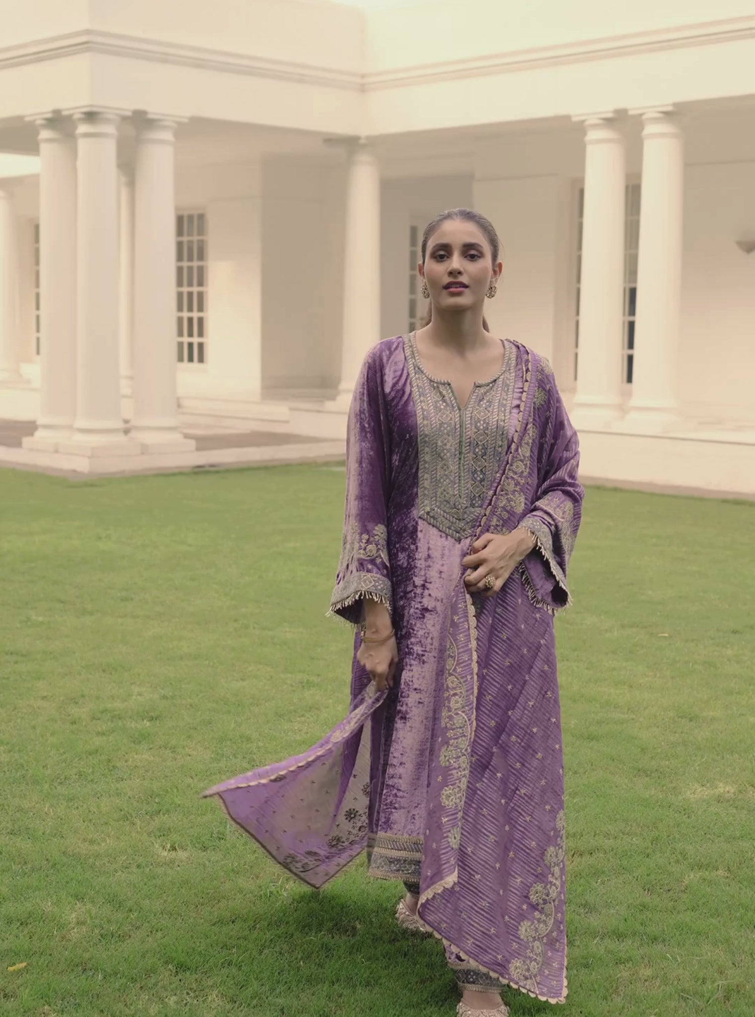 Soft lavender velvet reimagined in a straight-cut kurta set, paired with coordinated pants and a Banarasi Stripe Pani Gold dupatta. A subtle interplay of sheen and tradition-perfect for day weddings and festive dinners.
