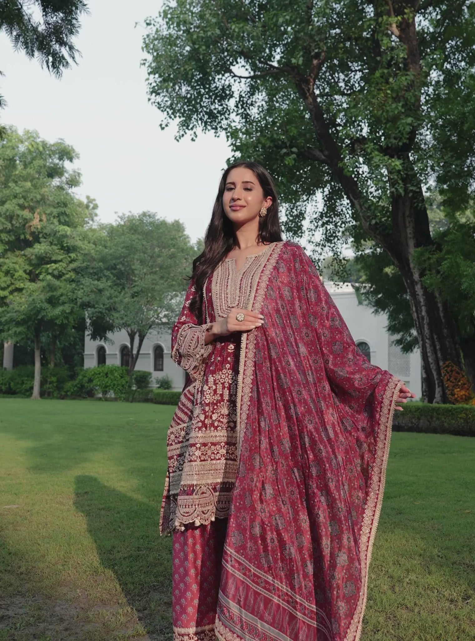 In a warm red Ajrakh palette, this organza kurta set features detailed embroidery along the yoke and hem, creating a rich, handcrafted look. The soft silhouette is paired with printed Pima satin pants and an airy organza dupatta. Perfect for intimate winter weddings, house functions and festive evenings.