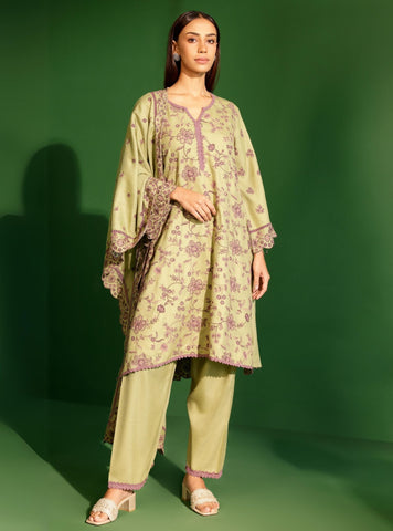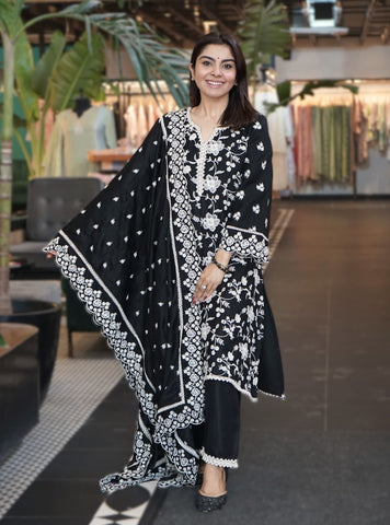 This Classic White Wool Set Is A Luxurious Fusion Of Comfort And Elegance, Perfect For A Sophisticated Winter Look. The Kurta Is Embellished With Intricate Floral Embroidery In A Contrasting Navy Hue. The Kurta Features A V-Neckline Framed By Scalloped Lace Detailing In Matching Navy. The Sleeves Are Finished With An Embroidered Cuff And Scalloped Edges. The Matching Pants Are Tailored For A Sleek Silhouette. They Are Completed With Scalloped Navy Lace Along The Hem, Tying The Ensemble Together Beautifully. Finish The Look With The Matching Embroidered Dupatta.