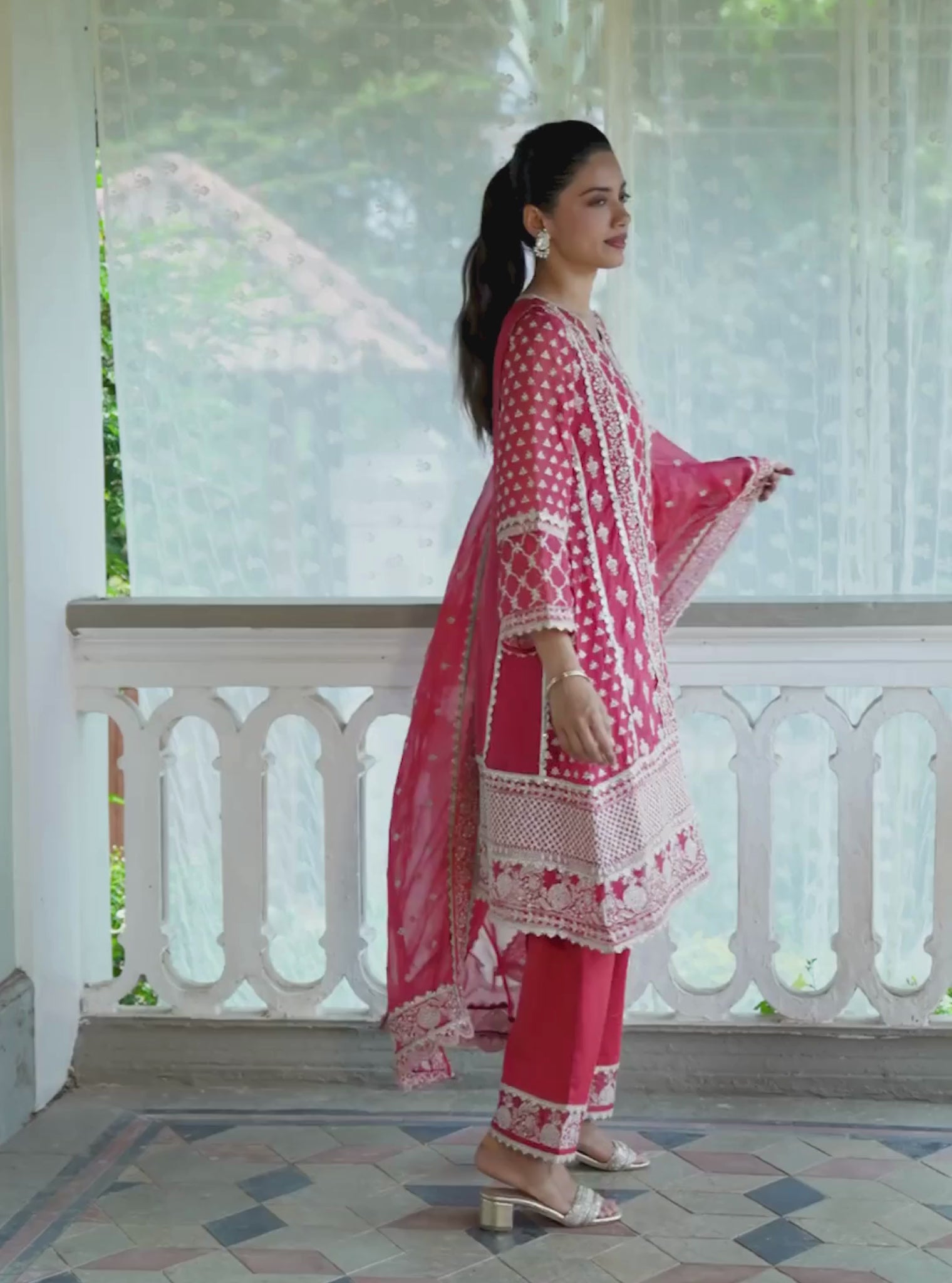 A Celebration Of Tradition And Elegance, This Red Kurta Set Is A Masterpiece Of Intricate Craftsmanship And Rich Hues. The Straight-Cut Kurta Is Adorned With Delicate Thread Embroidery. The Yoke Features A Gracefully Embellished Neckline, Framed By Dainty Lace Accents That Enhance Its Regal Charm. The Coordinating Straight Pants Perfectly Balance Comfort With Style. The Ensemble Is Elevated By A Stunning Red Dupatta, Intricately Bordered With Embroidery And Dotted With Subtle Motifs.