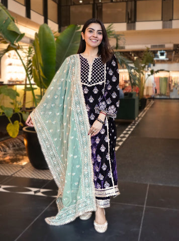 The Coordinating Velvet Trousers, With Their Minimalist Design, Create A Seamless Look That Highlights The Intricate Detailing On The Kurta. The Set Is Further Elevated By A Matching Dupatta Adorned With Subtle Gold Embroidery And Bordered With Fine Jaali Embroidery, Completing The Ensemble With Elegance.